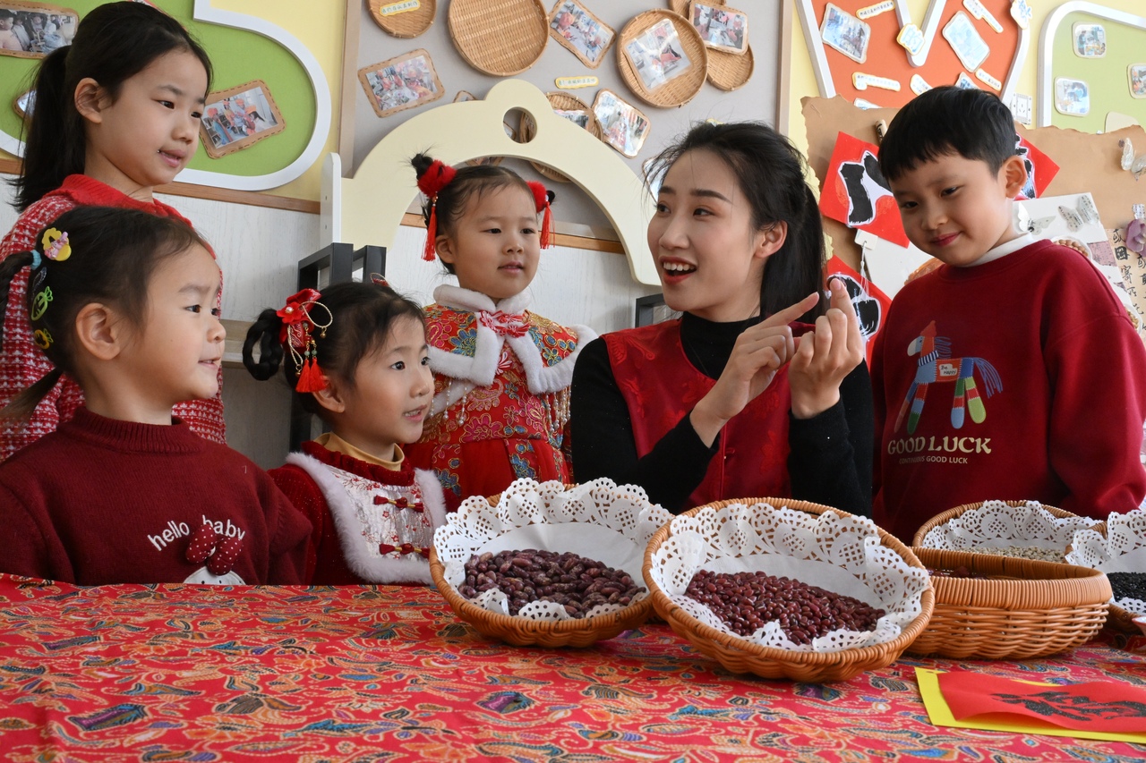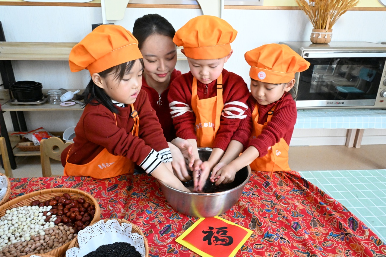 “小孩小孩你别馋,过了腊八就是年……”1月23日,山东省青岛市即墨区皋虞路幼儿园里一片欢声笑语,幼儿们在老师的精心组织下,沉浸式体验中国传统节日腊八的独特魅力。